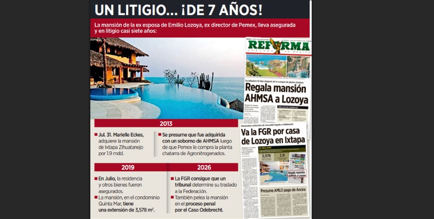 Ciudad de México 16 marzo 2026.- Un tribunal federal ordenó transferir a la Federación la mansión de Ixtapa-Zihuatanejo que Marielle Helene Eckes, ex esposa de Emilio Lozoya, adquirió en 2013 por un monto de 1.9 millones de dólares.