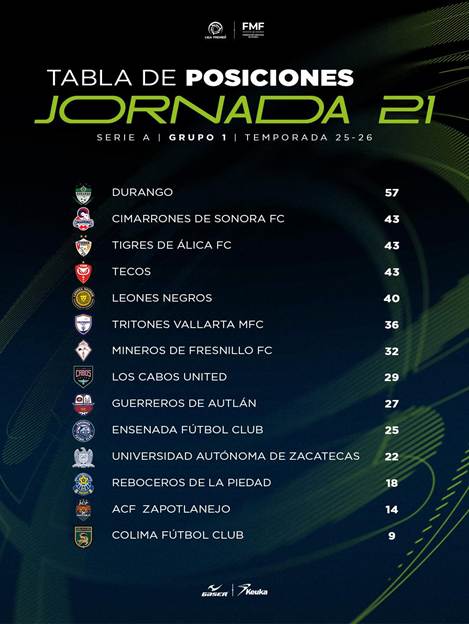 El Club Durango continúa firme en la cima de la Serie A de LIGA PREMIER al mantenerse como líder absoluto del Grupo Uno, consolidando una Temporada de alto rendimiento en la recta final del torneo.